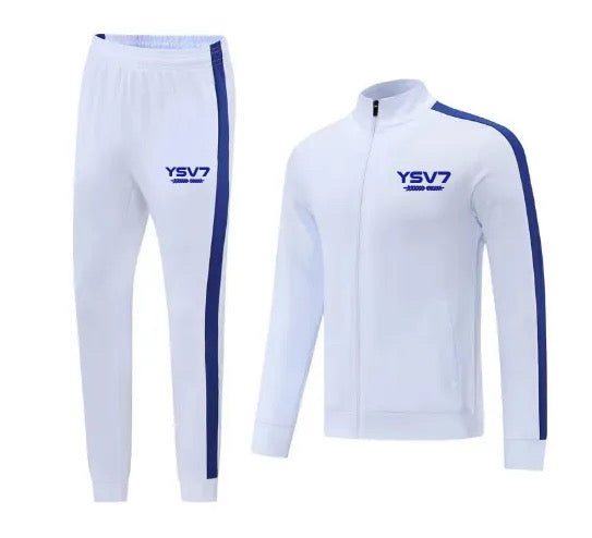 Get ready to stand out in this YSV7 White and Blue Tracksuit. Perfect for any outdoor or sports occasion, this tracksuit includes a zipped jacket and bottoms, making it the ideal choice for activewear. The fabric type is polyester, ensuring comfort and durability during any activity. The tracksuit is suitable for men and comes in a white colour, making it perfect for a themed holiday outfit. It is a must-have addition to any wardrobe, suitable for any taste or style. Get your hands on this stylish tracksuit today and make a statement wherever you go!