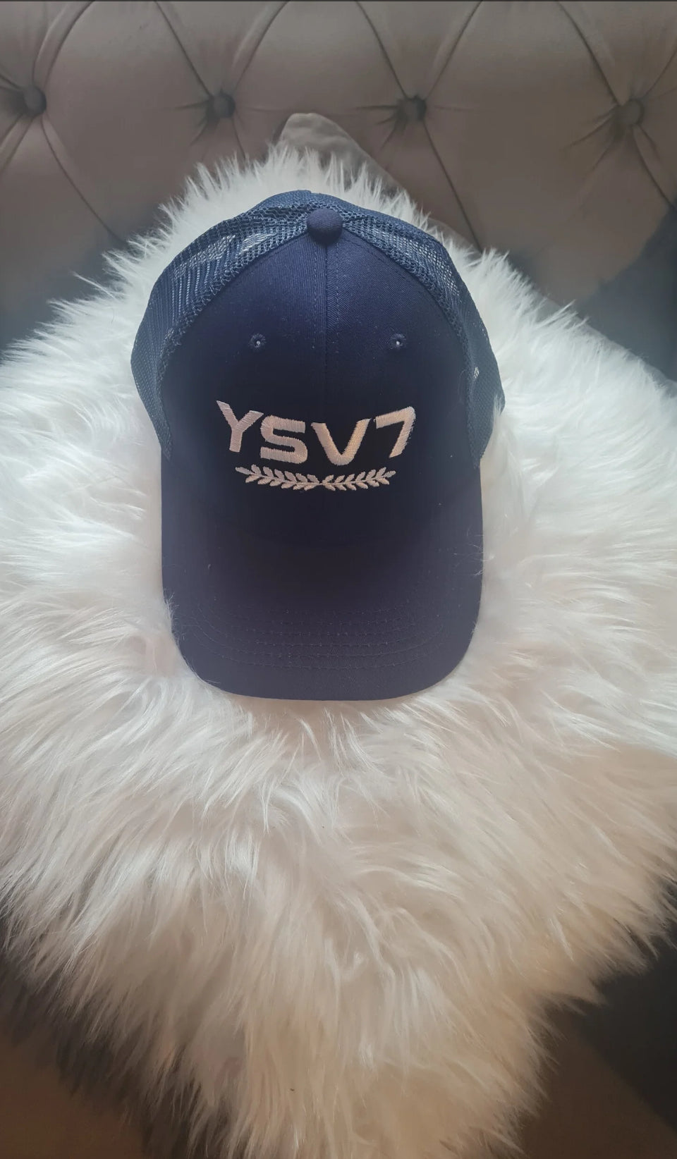 Step out in style with our YSV7 navy snapback cap with white logo.